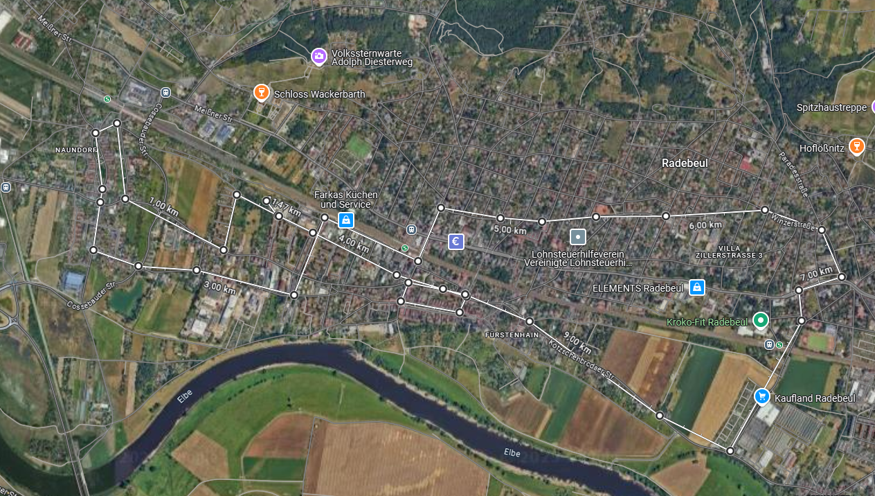Stellen der Fahrzeuge auf Wilhelm-Eichler-Straße zwischen Emil-Schüller-Straße und Lindenweg, Fahrt über Lindenweg, Kötitzer Straße, Bertheltstraße, Johannisbergstraße, Altnaundorf, Kötitzer Straße, Fabrikstraße, Emil-Schüller-Straße, Güterhofstraße, Bahnhofstaraße, Meißner Straße, Heinrich-Zille-Straße, Winzerstraße, Meißner Straße, Weintraubenstraße, Kötzschenbrodaer Straße, Vorwerkstraße, Hermann-Ilgen-Straße, Bahnhofstraße, Oscar-Pletsch-Straße, Güterhofstraße, Altkötzschenbroda, Gradsteg, Hermann-Illgen-Straße und zurück bis zur Wilhelm-Eichler-Straße